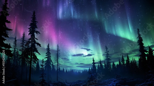 Wall mural the aurora borealis creating a magical display over a forest clearing - Wall murals Wall mural the aurora borealis creating a magical display over a forest clearing - Wall murals