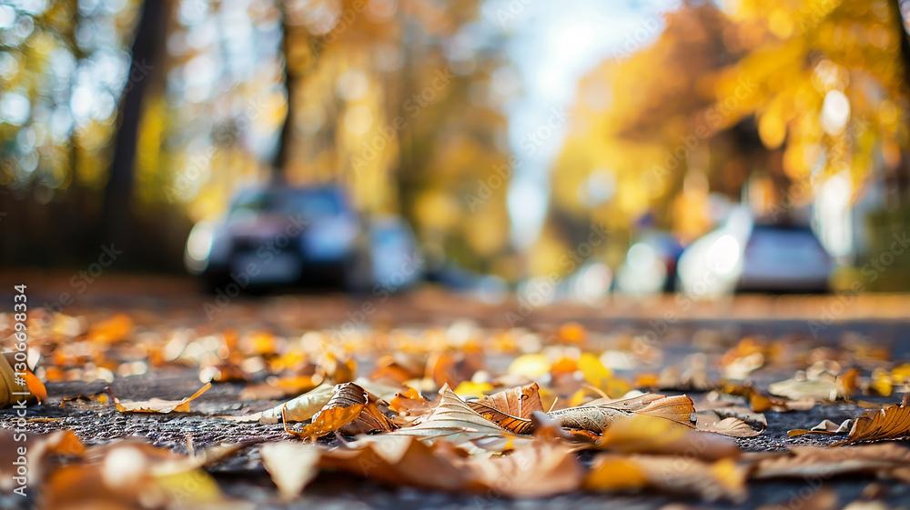 Wall mural : The background is an autumn park, a blurred backdrop of yellow trees