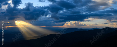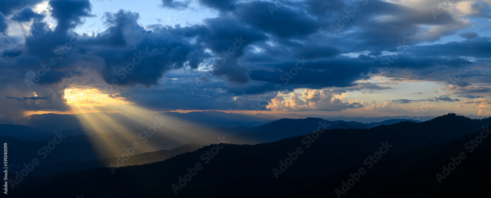 Wall mural the bright rays of the sun are shining from saturated clouds to mountain range before sunset.