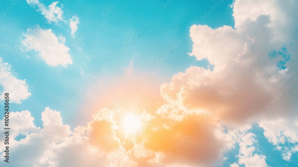 Wall mural the bright sun radiates warmth as it filters through the fluffy clouds, creating a tranquil and invi - Wall murals Wall mural the bright sun radiates warmth as it filters through the fluffy clouds, creating a tranquil and invi - Wall murals