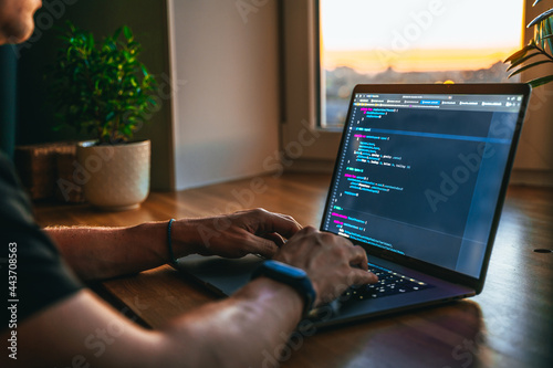 The watermark will not be included on Wall mural.: The code is on a laptop on a wooden table in front of the window in the dark with a view of the ligh