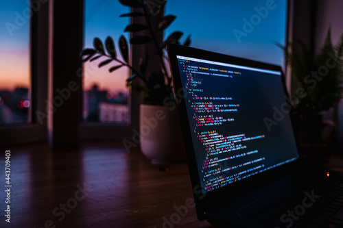 The watermark will not be included on Wall mural.: The code is on a laptop on a wooden table in front of the window in the dark with a view of the ligh