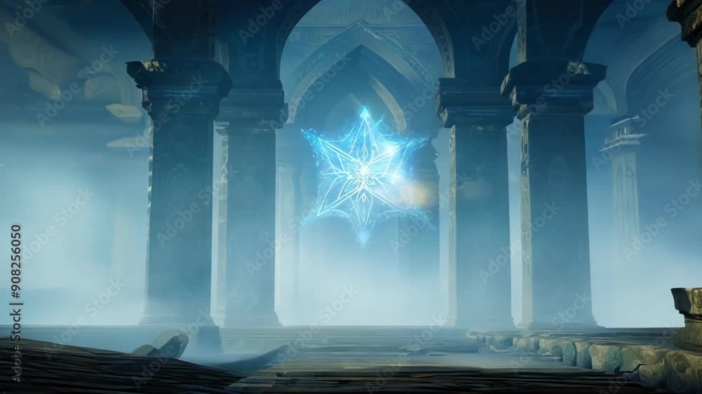 Wall mural the ethereal glow from floating spell books illuminates a misty ancient temple creating an aura of o - Wall murals Wall mural the ethereal glow from floating spell books illuminates a misty ancient temple creating an aura of o - Wall murals