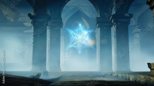 Wall mural the ethereal glow from floating spell books illuminates a misty ancient temple creating an aura of o