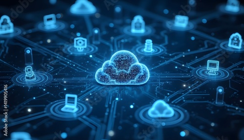 Wall mural : The evolution of abstract cloud computing networks has revolutionized digital technology and data tr