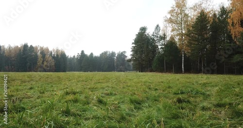 Wall mural the field with a grass and the wood on a background in autumn day. dolly shot