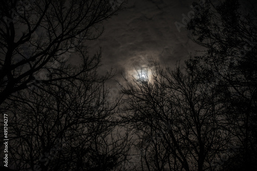 Wall mural : The full moon in cloudy sky seen through branches of trees at night