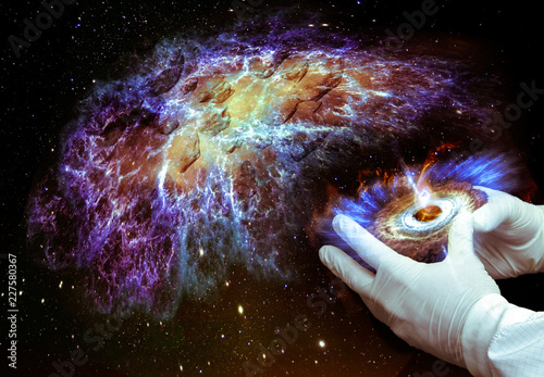 Wall mural the hands of the future scientist in gloves hold a torch and create a new galaxy. elements of this i