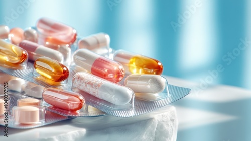 Wall mural the image captures a close-up view of colorful medicine capsules and tablets, focusing on the detail