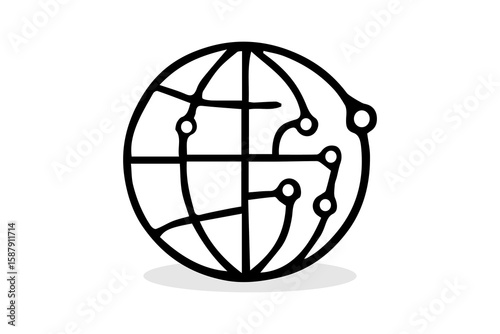 Wall mural : The image is a black and white line art icon depicting a globe with integrated circuit or network el