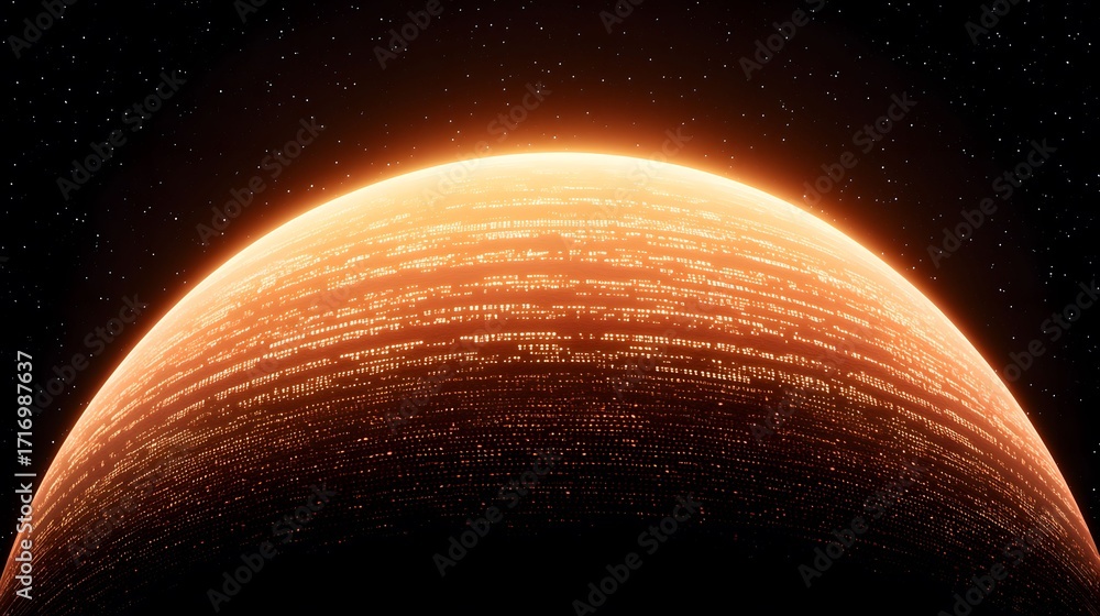The image showcases a rendered planet in space, adorned with glowing patterns resembling city lightsWall mural