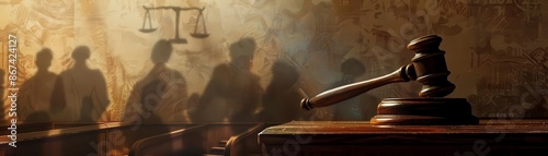 The image shows a gavel resting on a wooden table in a courtroom - behind the table, there are severaWall mural