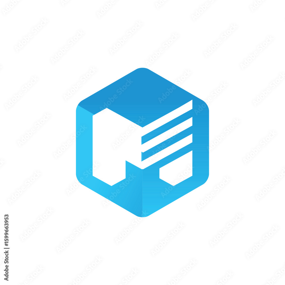Wall mural : The image shows a logo design of a letter m in white color inside a blue hexagonal cube in simple st