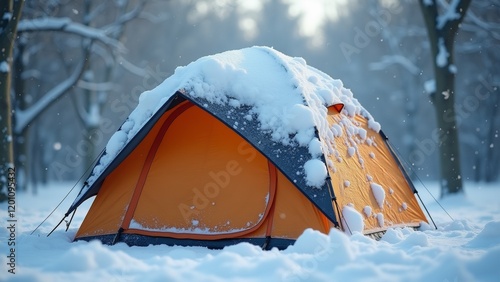 Wall mural the image shows a tent set up in a snowy forest. the tent is orange in color and is covered in a thi