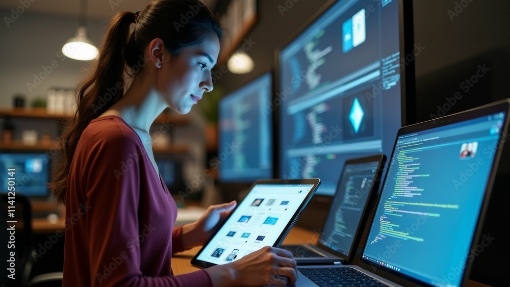 Wall mural : The image shows a young woman sitting at a desk in front of multiple computer monitors - she is holdi