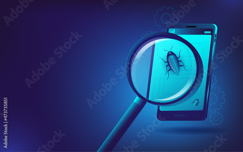 The watermark will not be included on Wall mural.: The magnifying glass looks for bugs in the mobile application - vector illustration on the topic of m
