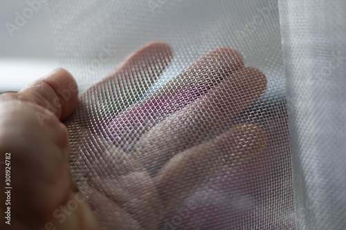 The watermark will not be included on Wall mural.: The mechanic is cutting the net to build a mosquito net -