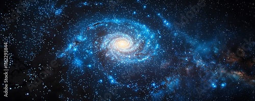 The watermark will not be included on Wall mural.: The milky way galaxy, a spiral of blue light illuminating stars against a black space background, sy