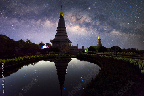 Wall mural : The milky way galaxy moving over a sacred temple at doi inthanon national park, chiang mai, thailand
