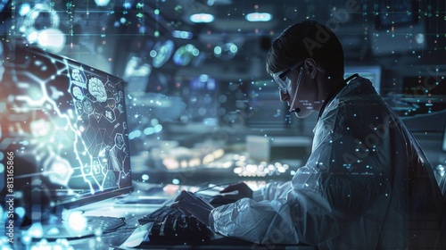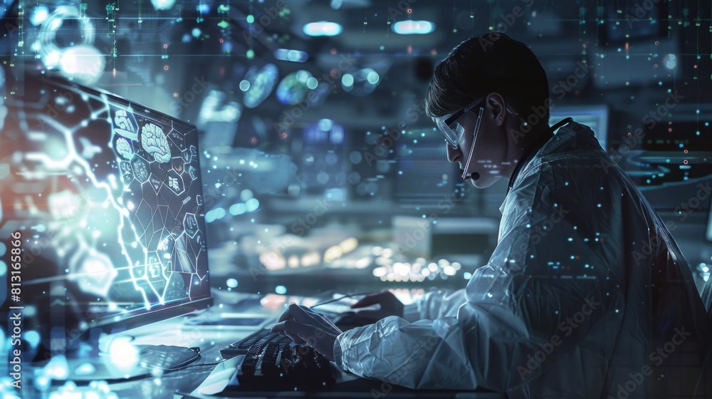 The watermark will not be included on Wall mural.: The person working on a computer with a background that includes abstract graphics of technology -