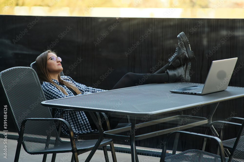 Wall mural the programmer girl works at the computer girls in science. in an empty office during a pandemic. - Wall murals Wall mural the programmer girl works at the computer girls in science. in an empty office during a pandemic. - Wall murals