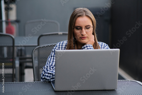 The watermark will not be included on Wall mural.: The programmer girl works at the computer girls in science - in an empty office during a pandemic -