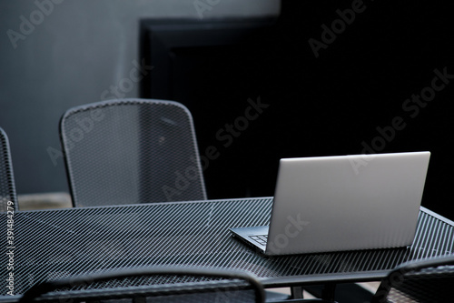 Wall mural the programmer girl works at the computer girls in science. in an empty office during a pandemic.
