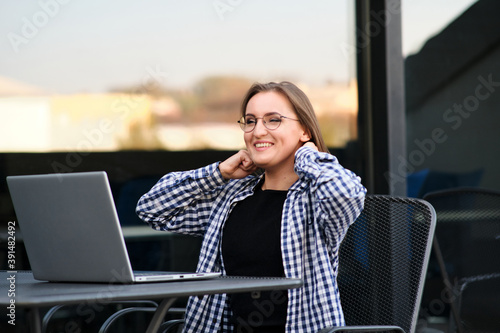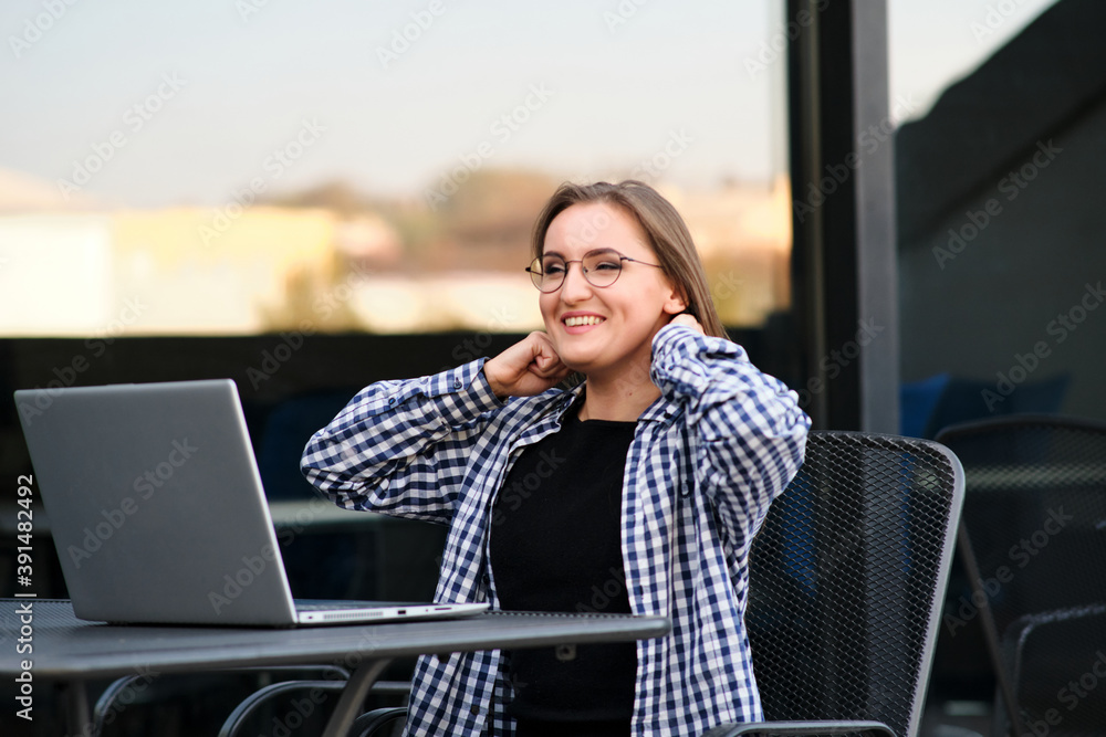 The watermark will not be included on Wall mural.: The programmer girl works at the computer girls in science - in an empty office during a pandemic -