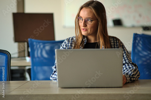 The watermark will not be included on Wall mural.: The programmer girl works at the computer girls in science - in an empty office during a pandemic -