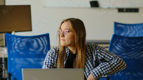 Wall mural the programmer girl works at the computer girls in science. in an empty office during a pandemic. - Wall murals Wall mural the programmer girl works at the computer girls in science. in an empty office during a pandemic. - Wall murals
