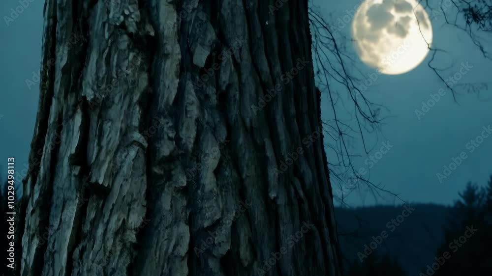 Wall mural the rough bark of a tree trunk is illuminated by the cool light of a full moon at twilight, creating