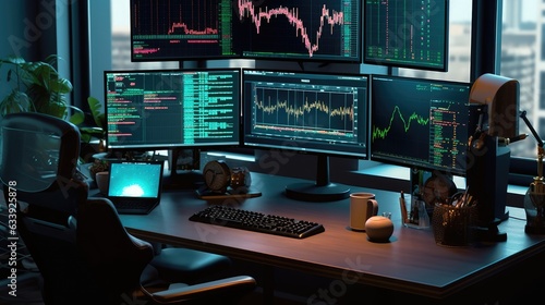 Wall mural the side view from a computer desk with multiple screens displaying stock market trading and candle