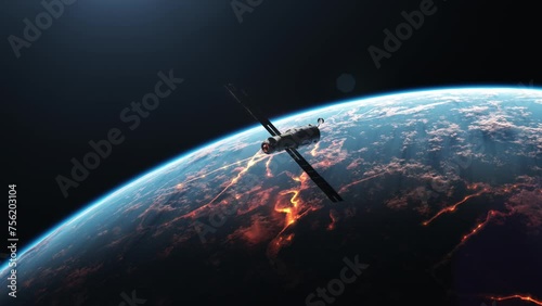 The watermark will not be included on Wall mural.: The space module is flying through the darkness of space in the orbit of a planet, where chaos and t