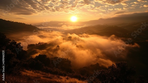 The watermark will not be included on Wall mural.: The sun is setting over the mountains covered in fog and smogged with smogged trees in the foregroun