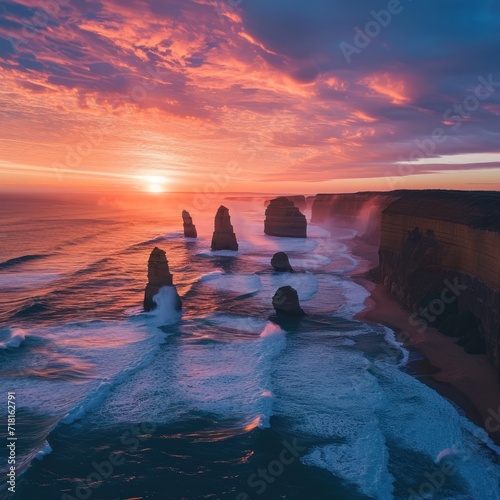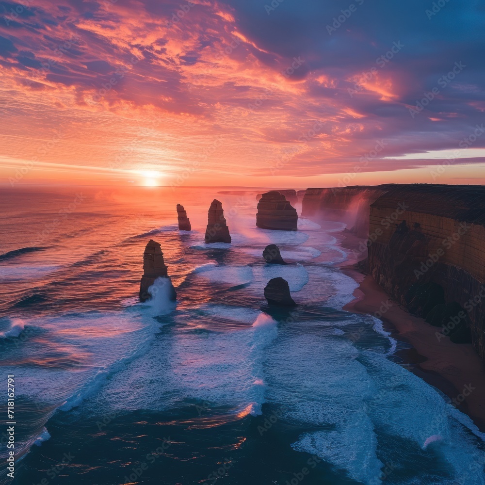 The watermark will not be included on Wall mural.: The sun is setting over the ocean with cliffs in the foreground and waves in the water on the right