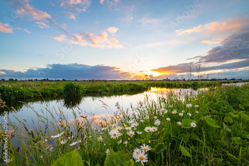 The watermark will not be included on Wall mural.: The sun sets over the dutch polder landscape near gouda, holland