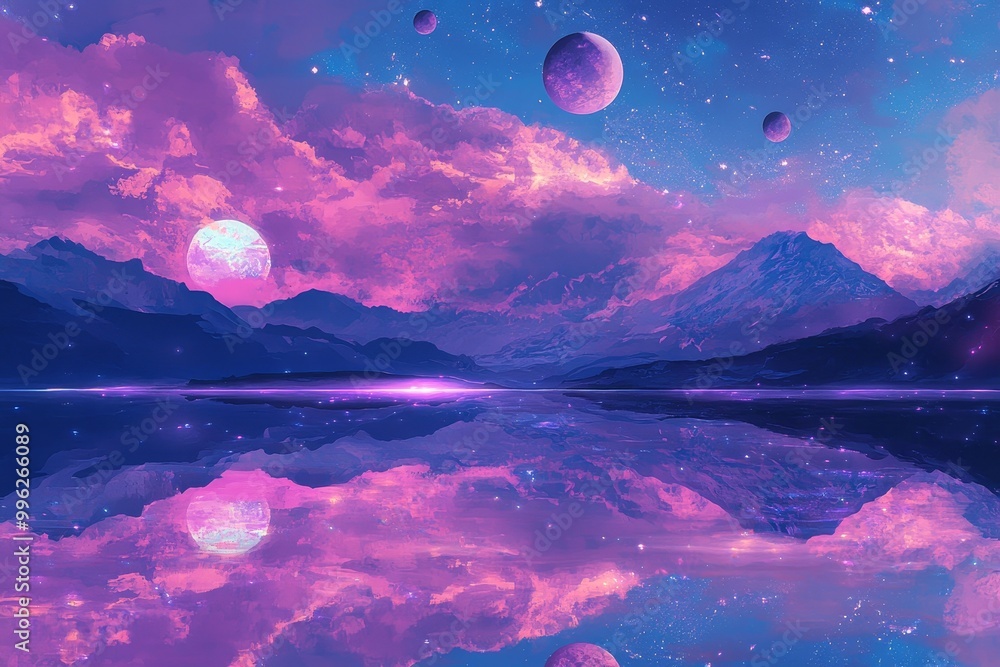 Wall mural the surface of an ocean planet is dotted with a glorious galaxy in an abstract graphic design