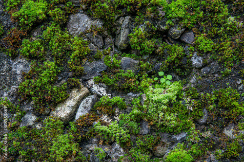 The texture of tree bark with moss - old tall trees with moss in forest - trees with green leaves in fWall mural