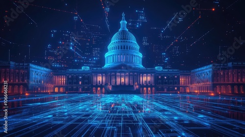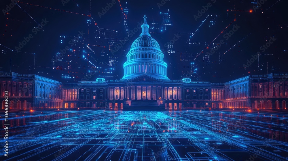 The watermark will not be included on Wall mural.: The us capitol building is digitally rendered with glowing blue and red lines emanating from it -