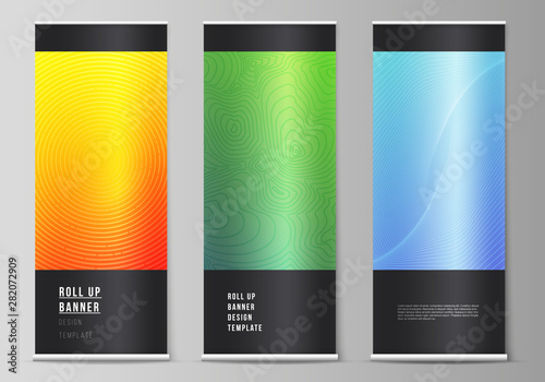 The vector illustration of the editable layout of roll up banner stands, vertical flyers, flags desiWall mural