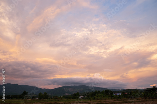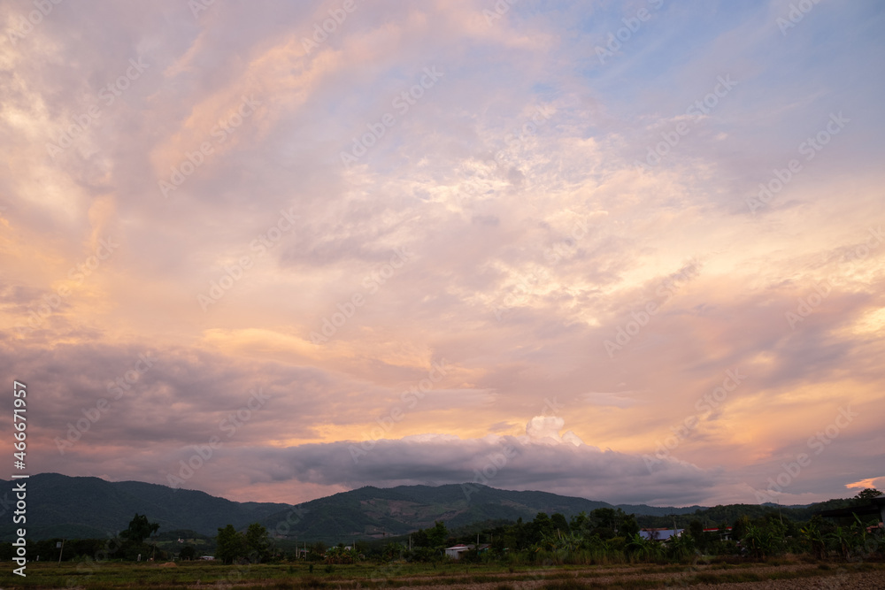Wall mural the white clouds have a strange shape and moutain. the sky and the open space have mountains below.