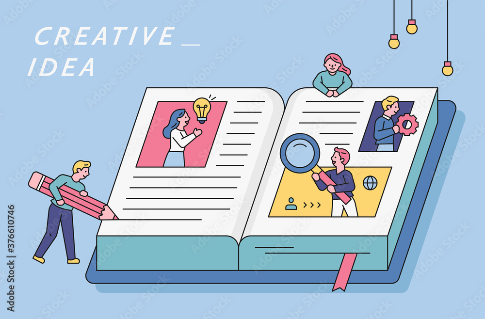 There is a large book open and people are looking for knowledge in it - flat design style minimal vecWall mural