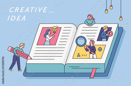 Wall mural : There is a large book open and people are looking for knowledge in it - flat design style minimal vec