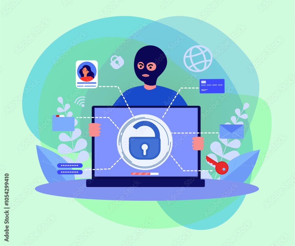 Wall mural thief in mask stealing computer vector illustration. laptop with lock on screen, hacker getting acce - Wall murals Wall mural thief in mask stealing computer vector illustration. laptop with lock on screen, hacker getting acce - Wall murals