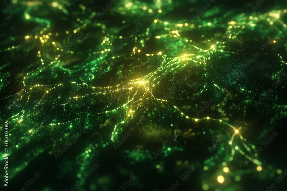 The watermark will not be included on Wall mural.: This abstract image illustrates a vibrant network structure with glowing green lights, creating an i