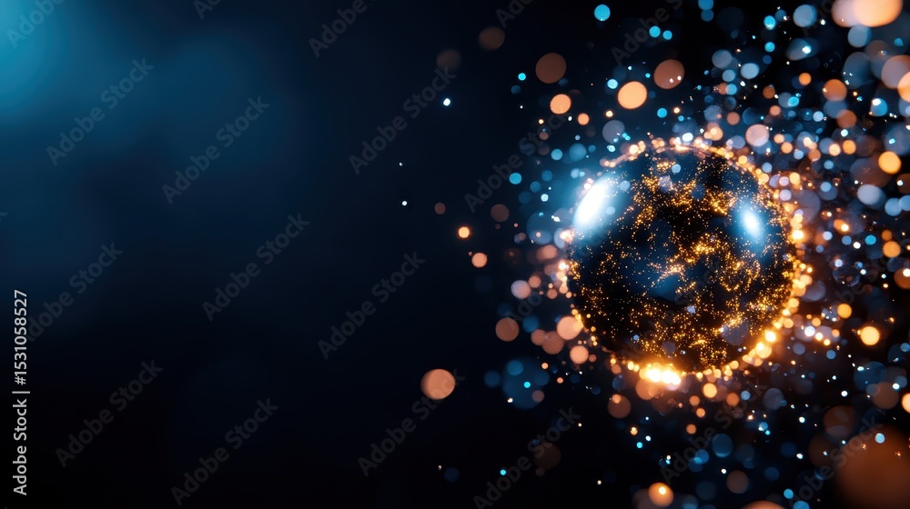 The watermark will not be included on Wall mural.: This captivating abstract image showcases a glowing spherical object surrounded by luminous particle