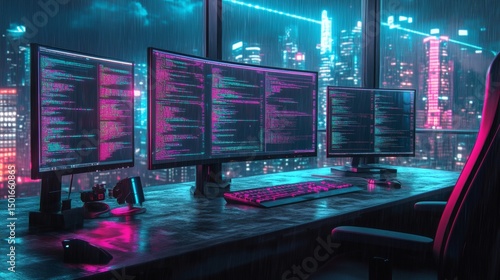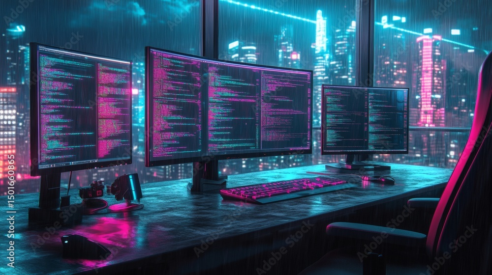 The watermark will not be included on Wall mural.: This illustration shows the world of computer programming, where people create software and games -