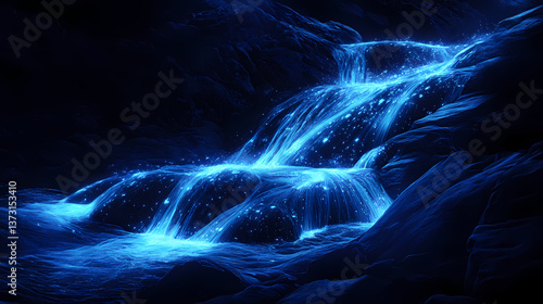 Wall mural this image features glowing blue light trails cascading over dark rocks at night, creating the appea - Wall murals Wall mural this image features glowing blue light trails cascading over dark rocks at night, creating the appea - Wall murals