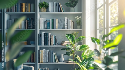 Wall mural this image showcases a modern bookshelf filled with books and decorative items, complemented by lush - Wall murals Wall mural this image showcases a modern bookshelf filled with books and decorative items, complemented by lush - Wall murals