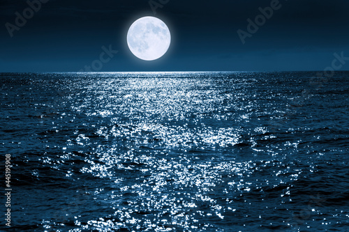 Wall mural this large full blue moon rises brightly over the calm ocean creating sparkles across the waves - Wall murals Wall mural this large full blue moon rises brightly over the calm ocean creating sparkles across the waves - Wall murals